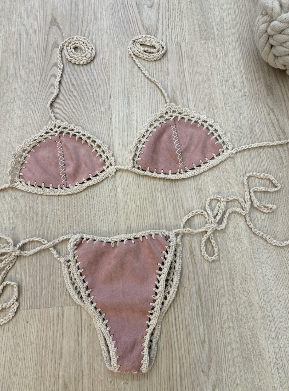 Este bikini es una caricia del verano: hecho con tejido rosa empolvado y rematado a mano en crochet natural, es una oda a la artesanía y la libertad. Inspirado en los ritmos suaves del sur de la India, conecta con tu esencia más salvaje, sin dejar de lado la dulzura.