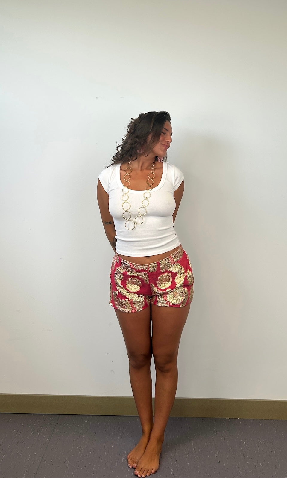 Este short rosa con grandes flores doradas es pura declaración de estilo. Brillante, cómodo y lleno de personalidad, es ideal para quienes no tienen miedo de destacar. Viste poder, viste flor.