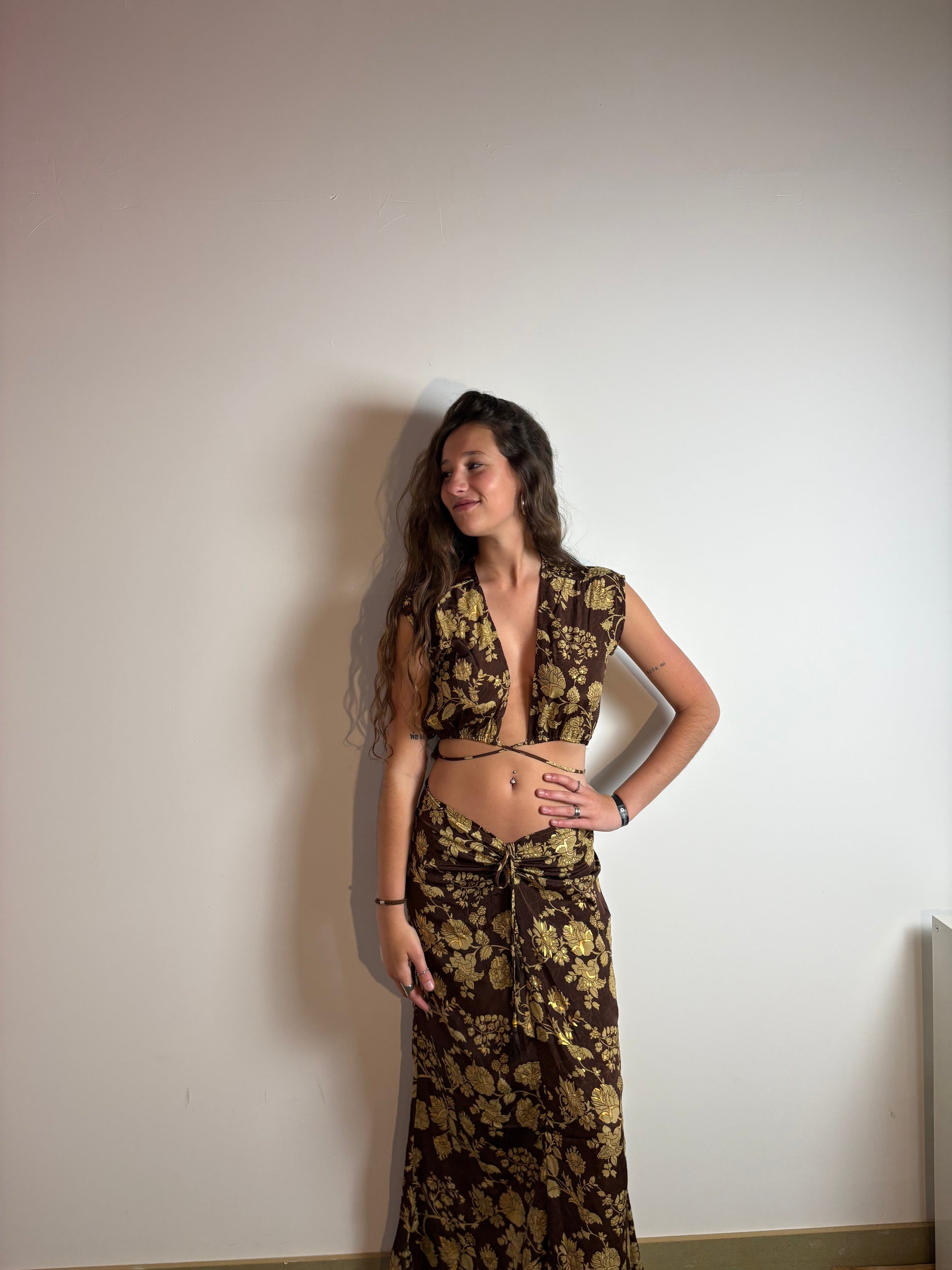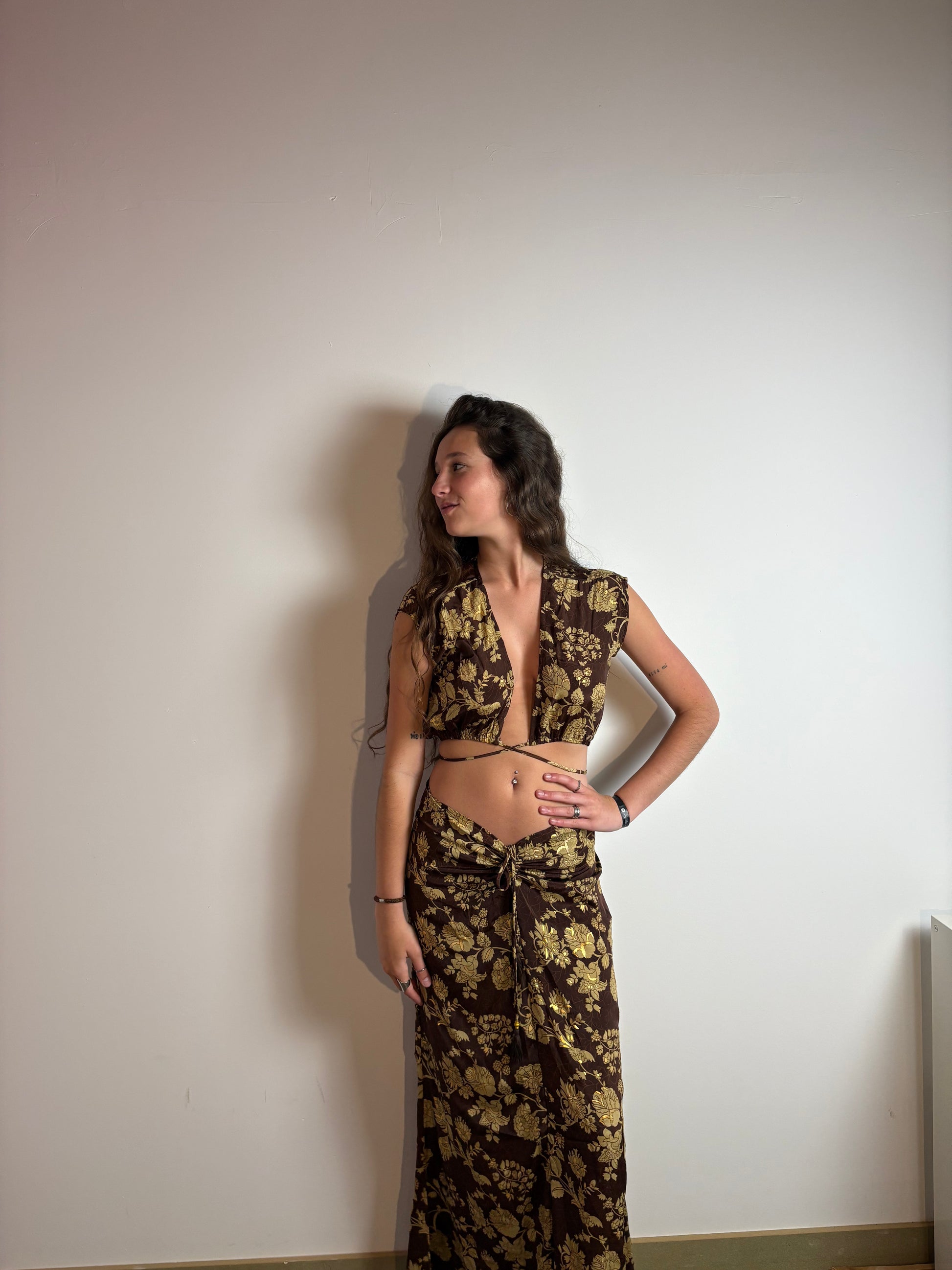 Este conjunto floral en marrón y dorado une fuerza y sensualidad con cada movimiento. El top envolvente y la falda con nudo frontal celebran tu feminidad auténtica.