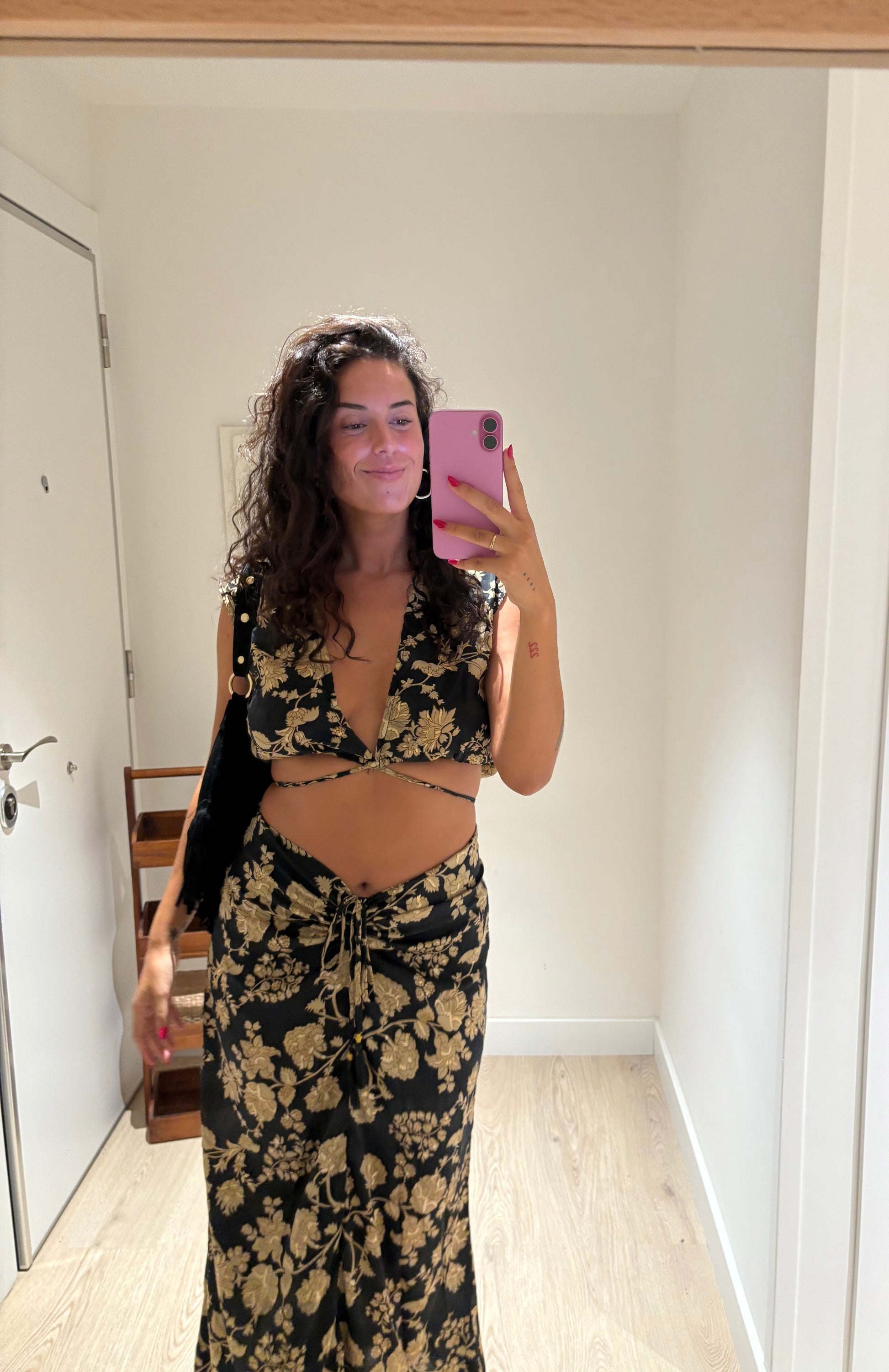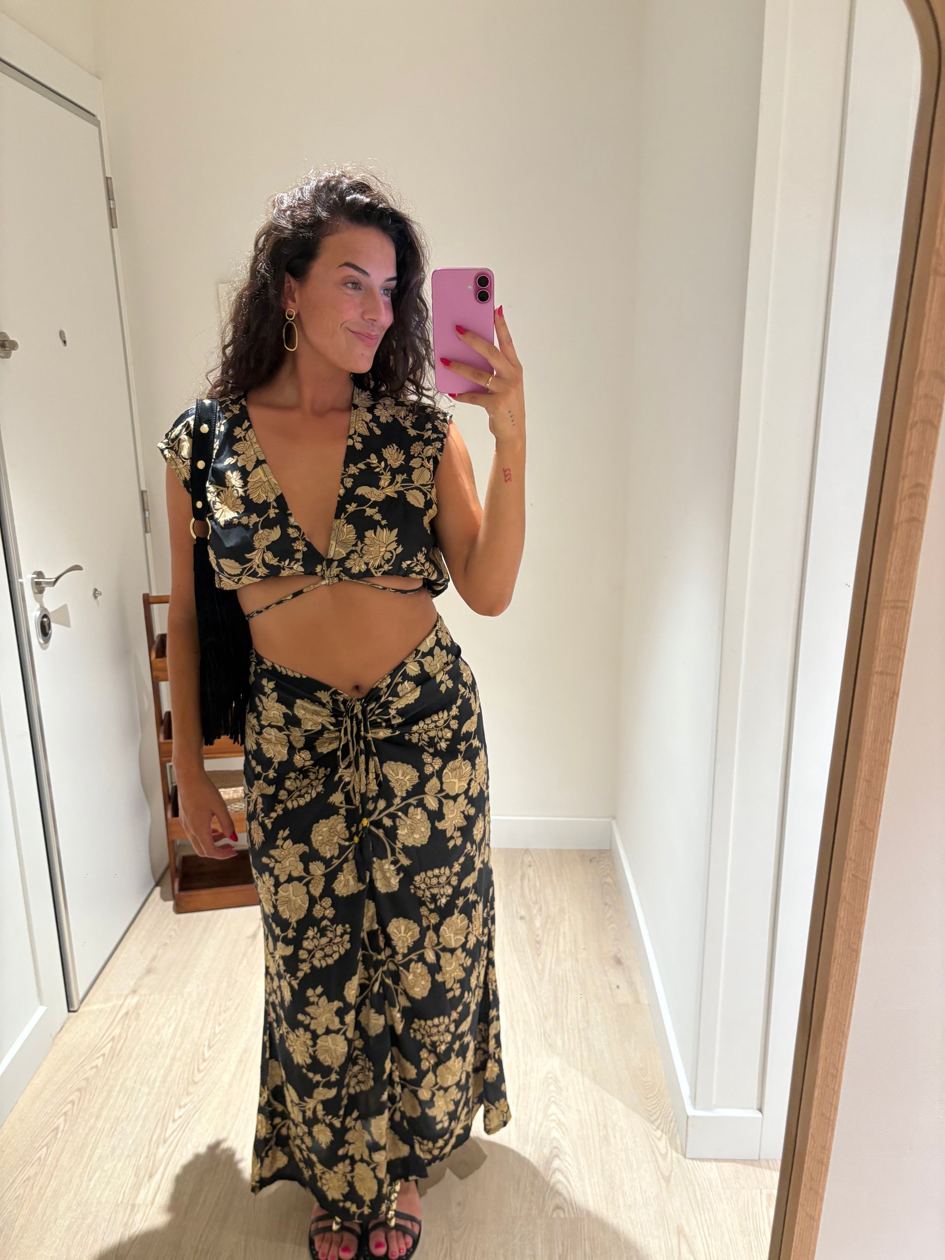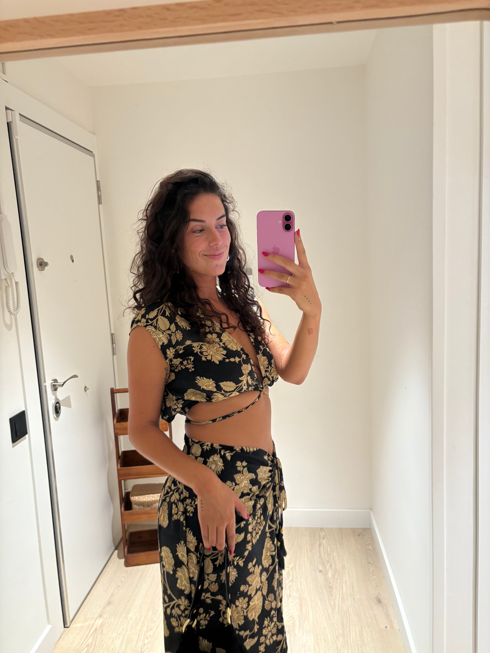 Este conjunto floral en negro y dorado une fuerza y sensualidad con cada movimiento. El top envolvente y la falda con nudo frontal celebran tu feminidad auténtica.