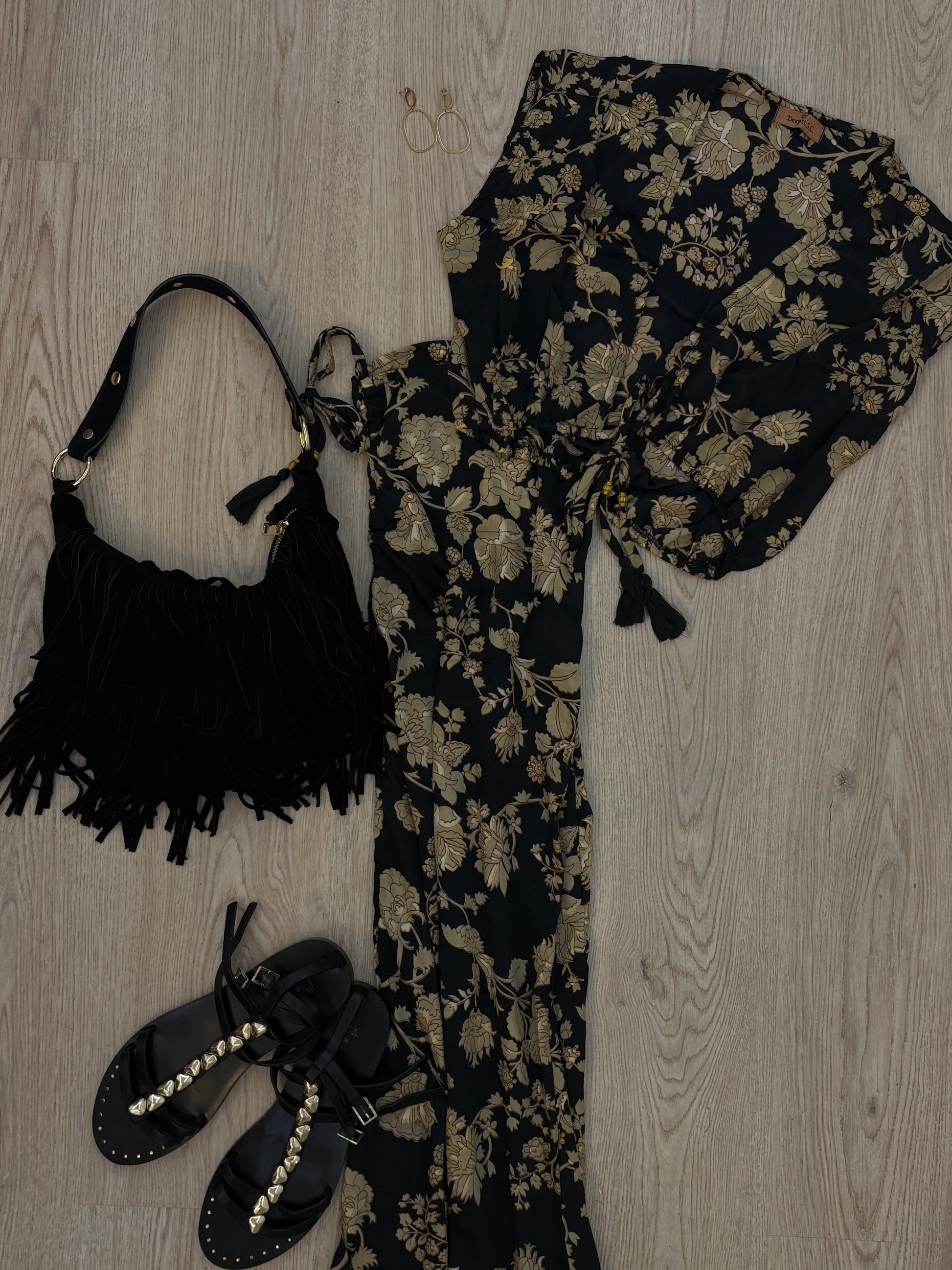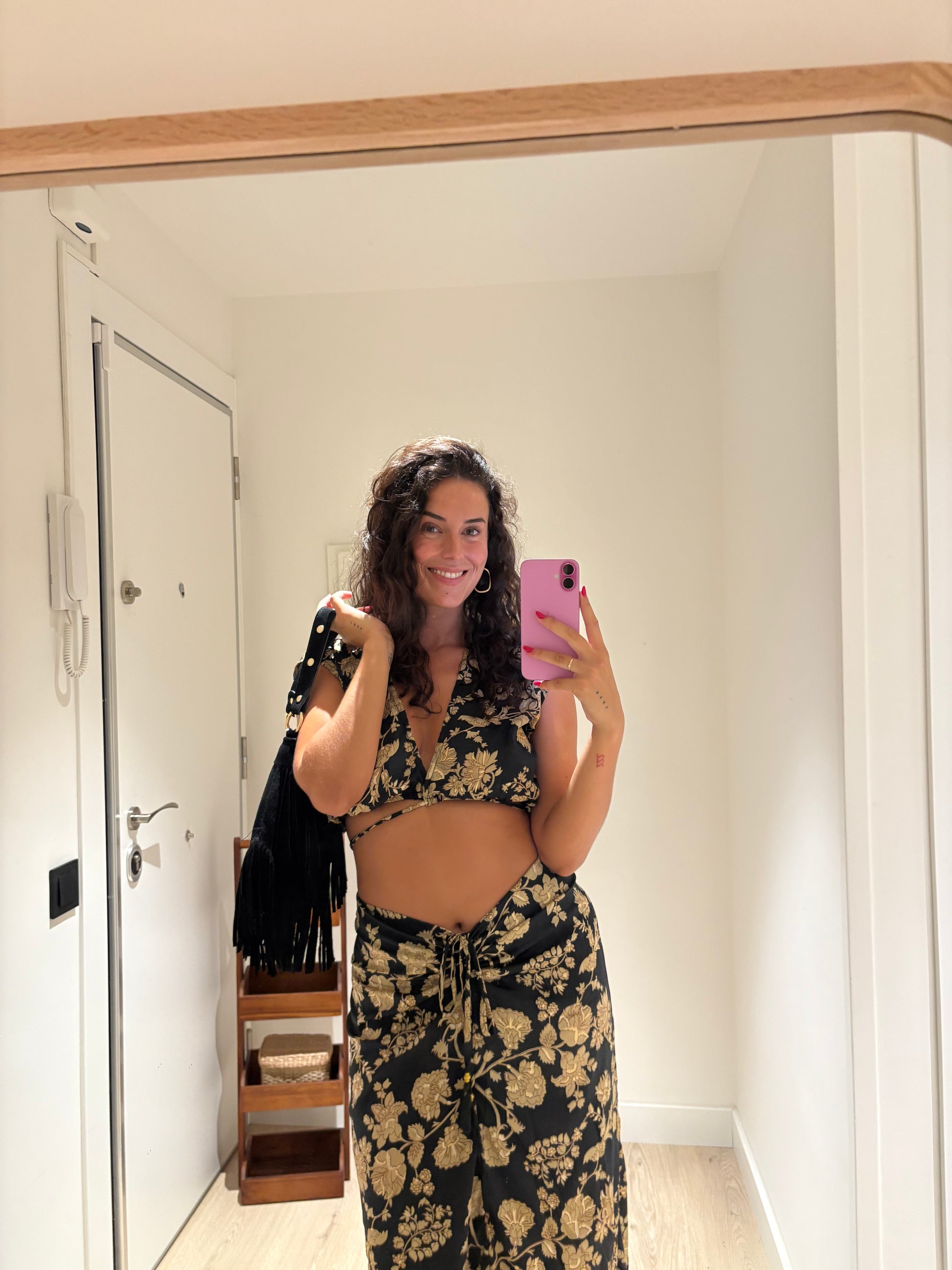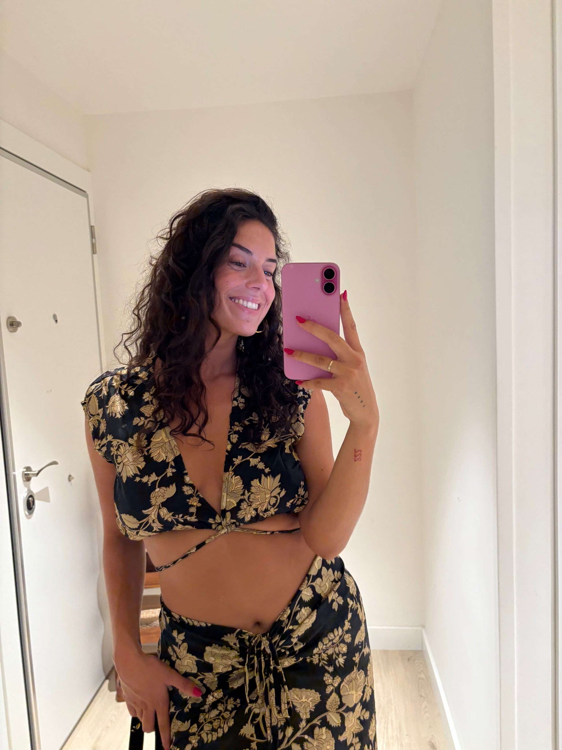 Este conjunto floral en negro y dorado une fuerza y sensualidad con cada movimiento. El top envolvente y la falda con nudo frontal celebran tu feminidad auténtica.