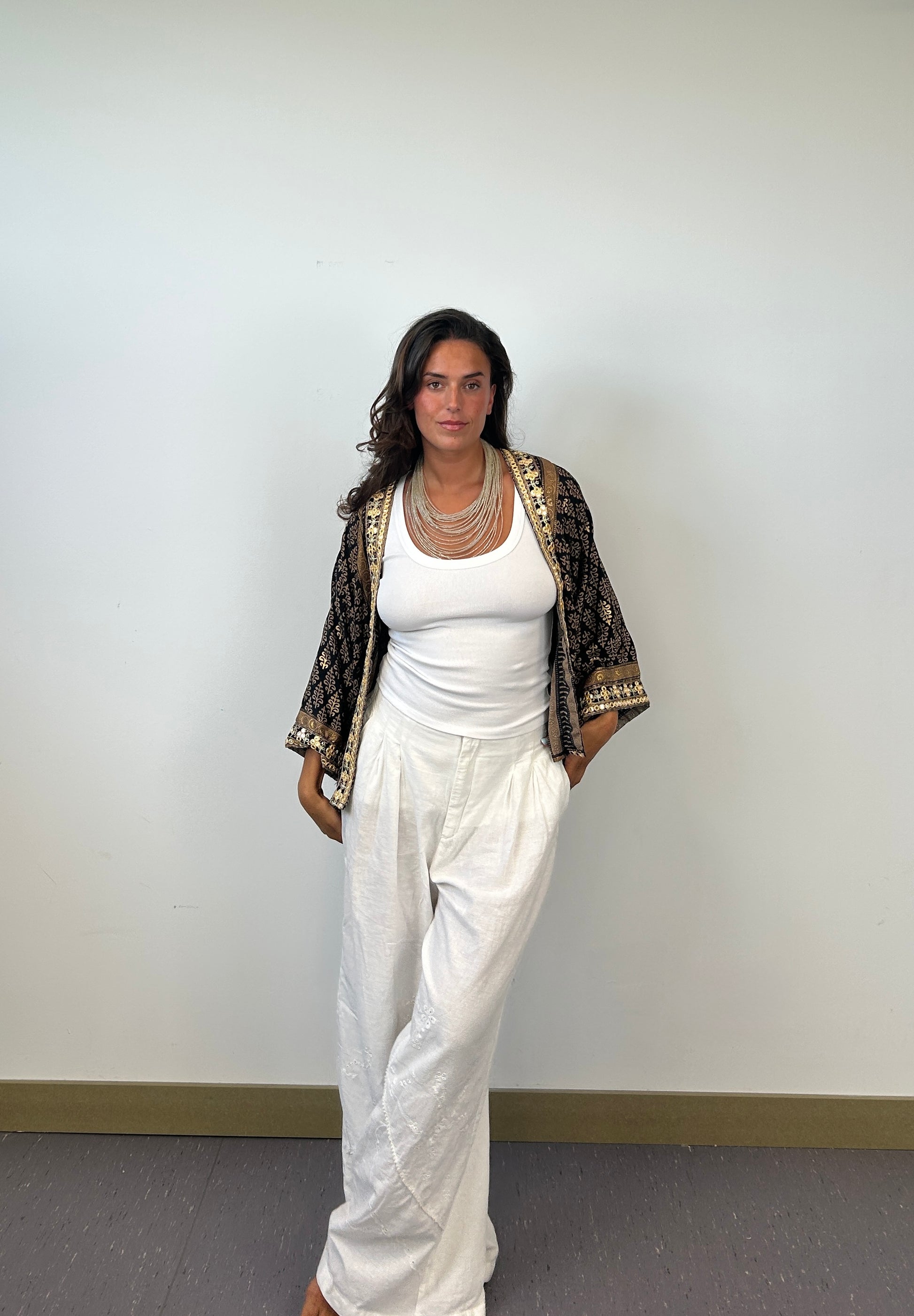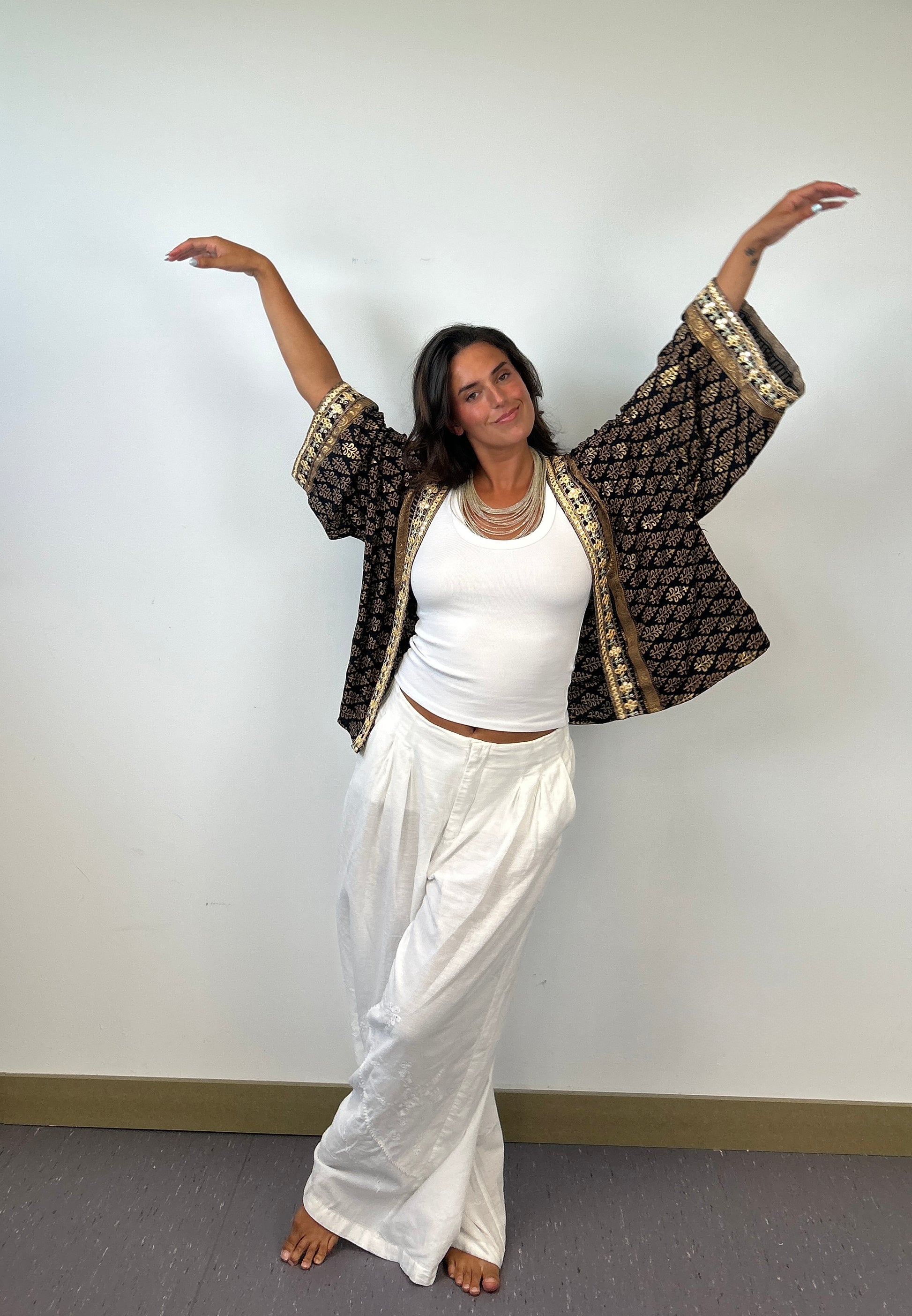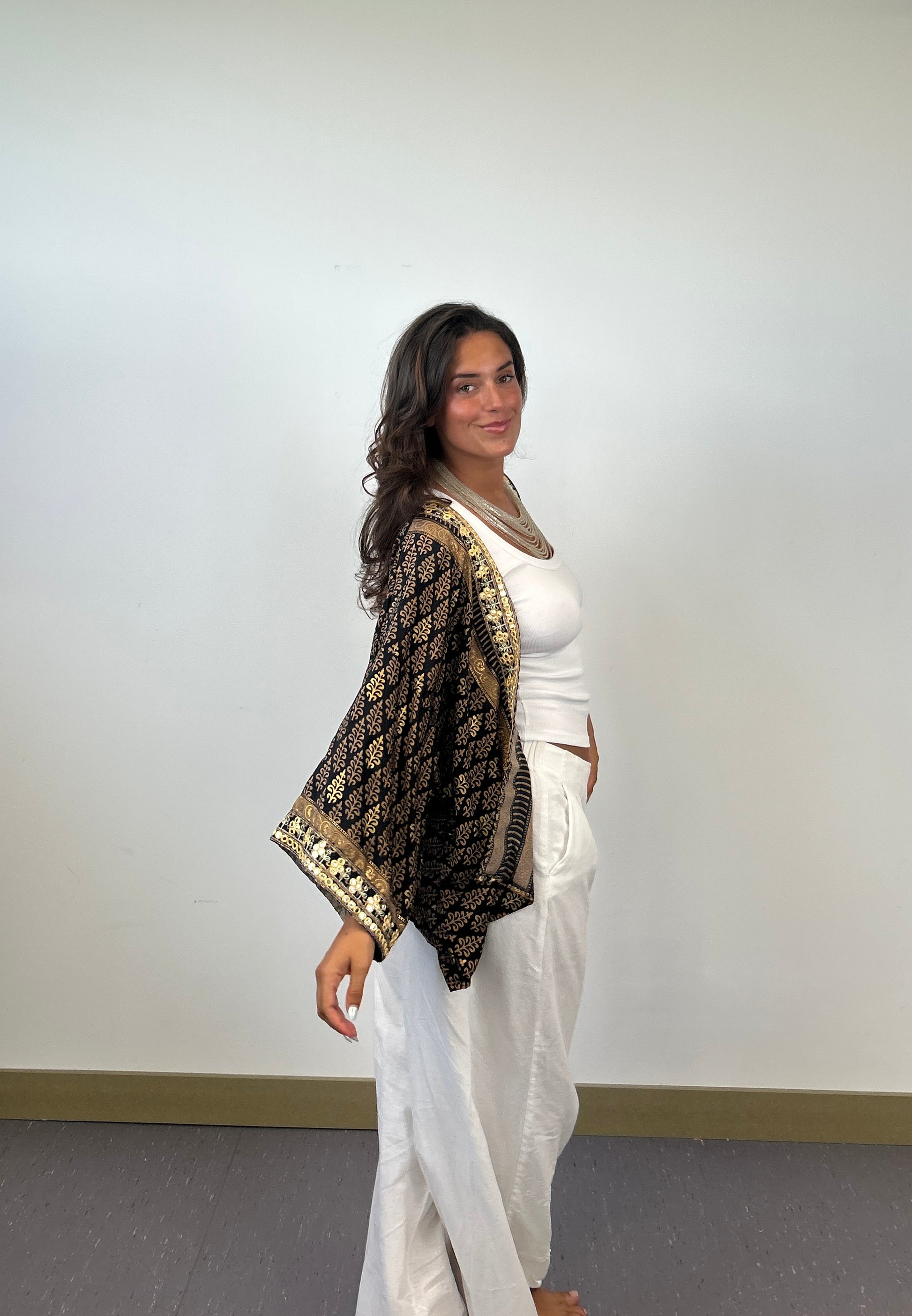 Este kimono negro con detalles dorados es pura presencia. Su tejido fluido y el brillo sutil de los bordados envuelven tu cuerpo con fuerza serena. Para mujeres que caminan con historia, estilo y poder.
