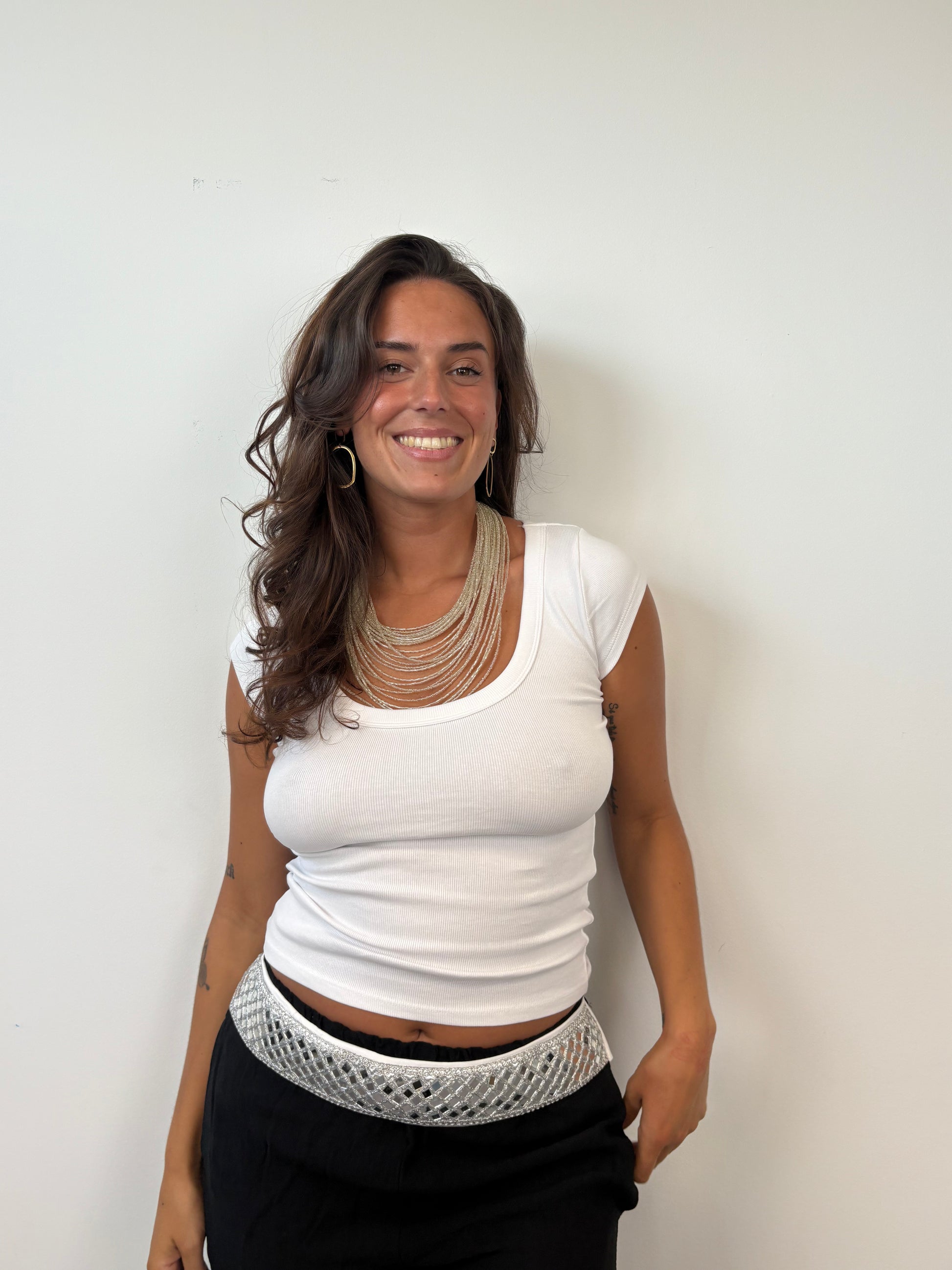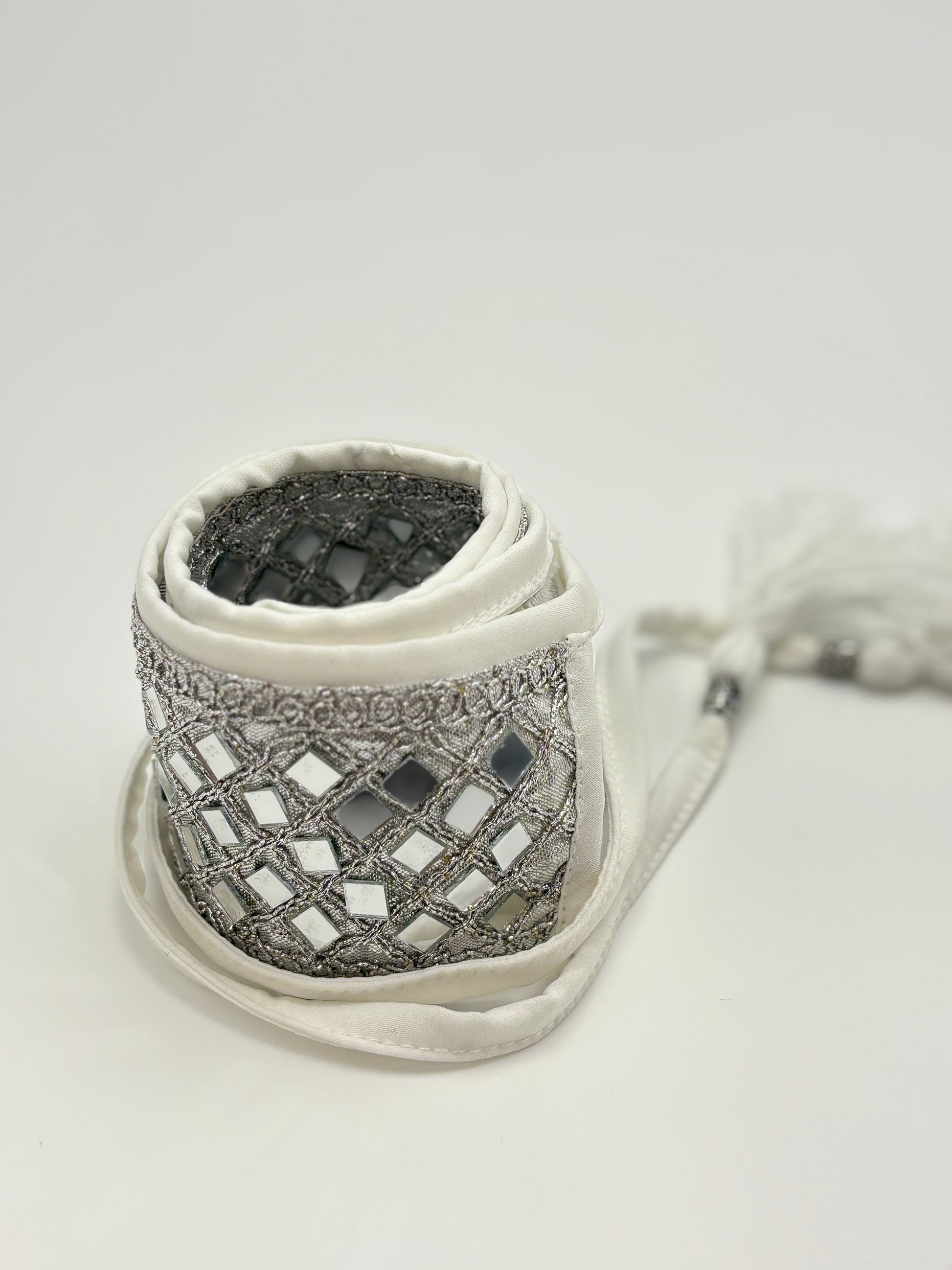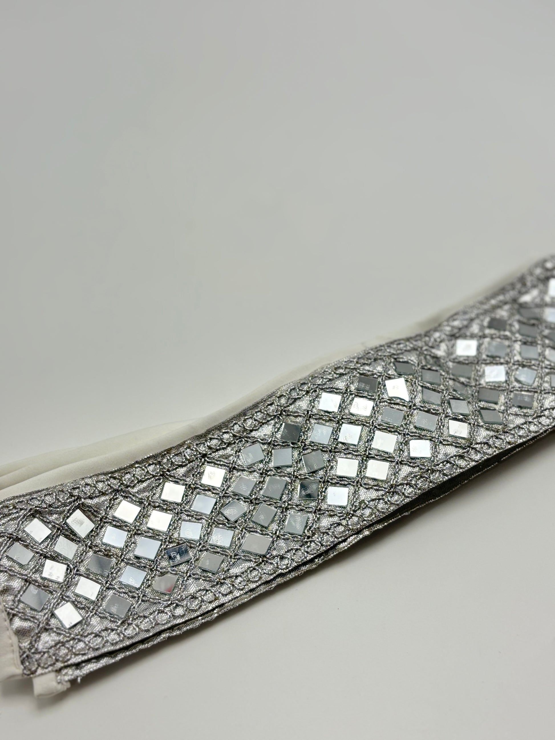 Este cinturón es pura luz. Cada espejuelo refleja tu fuerza interior y transforma cualquier look en un statement. El fondo blanco resalta los detalles plateados, evocando el brillo de una noche en el desierto indio. ✨