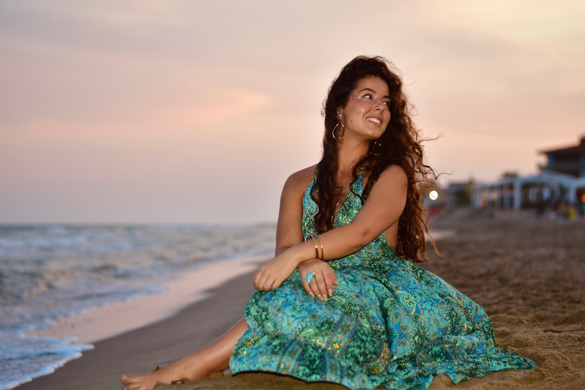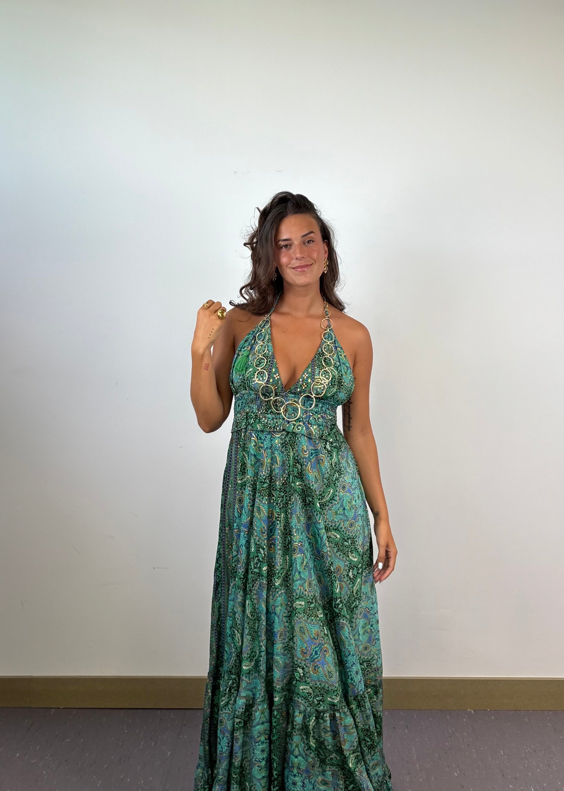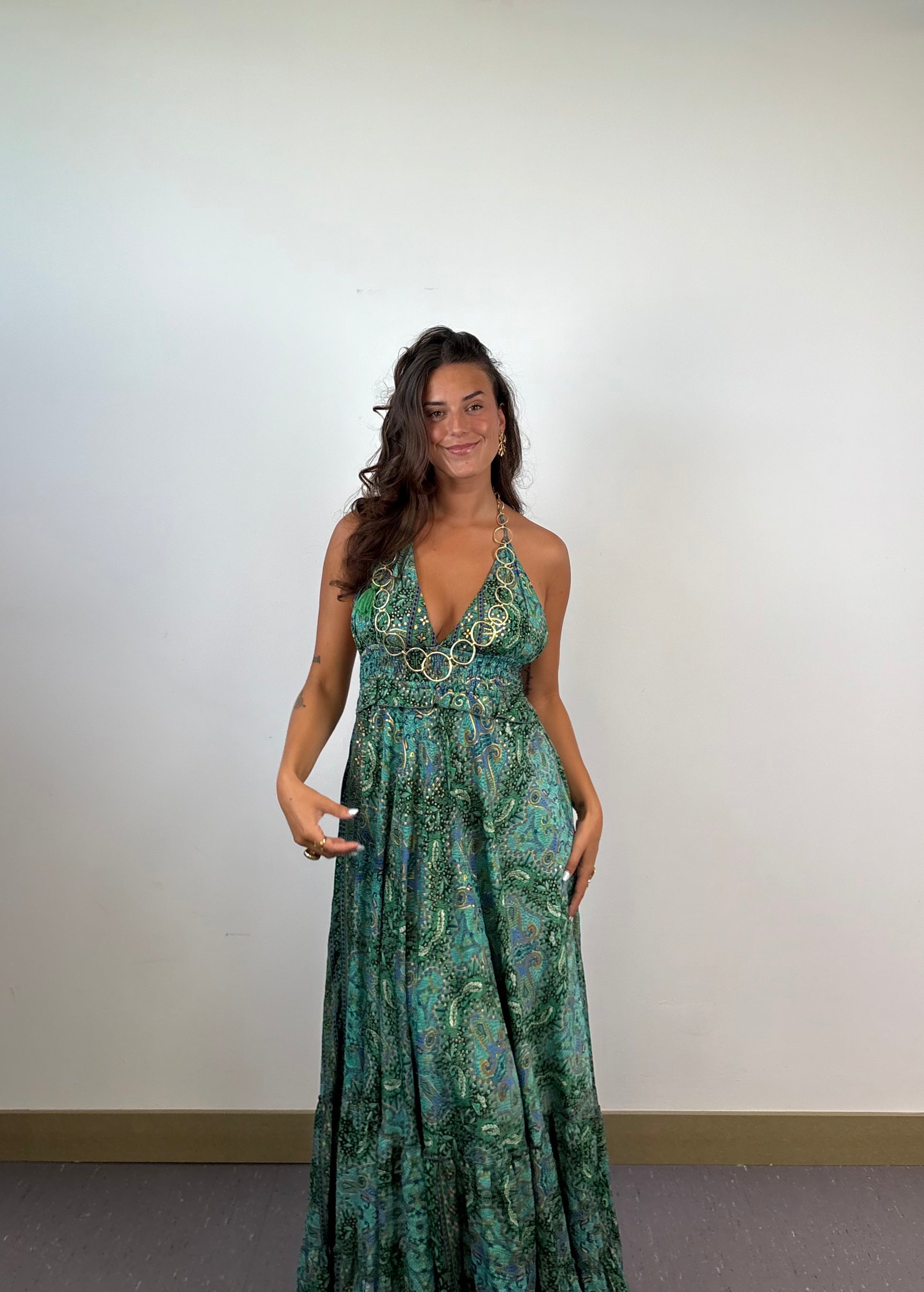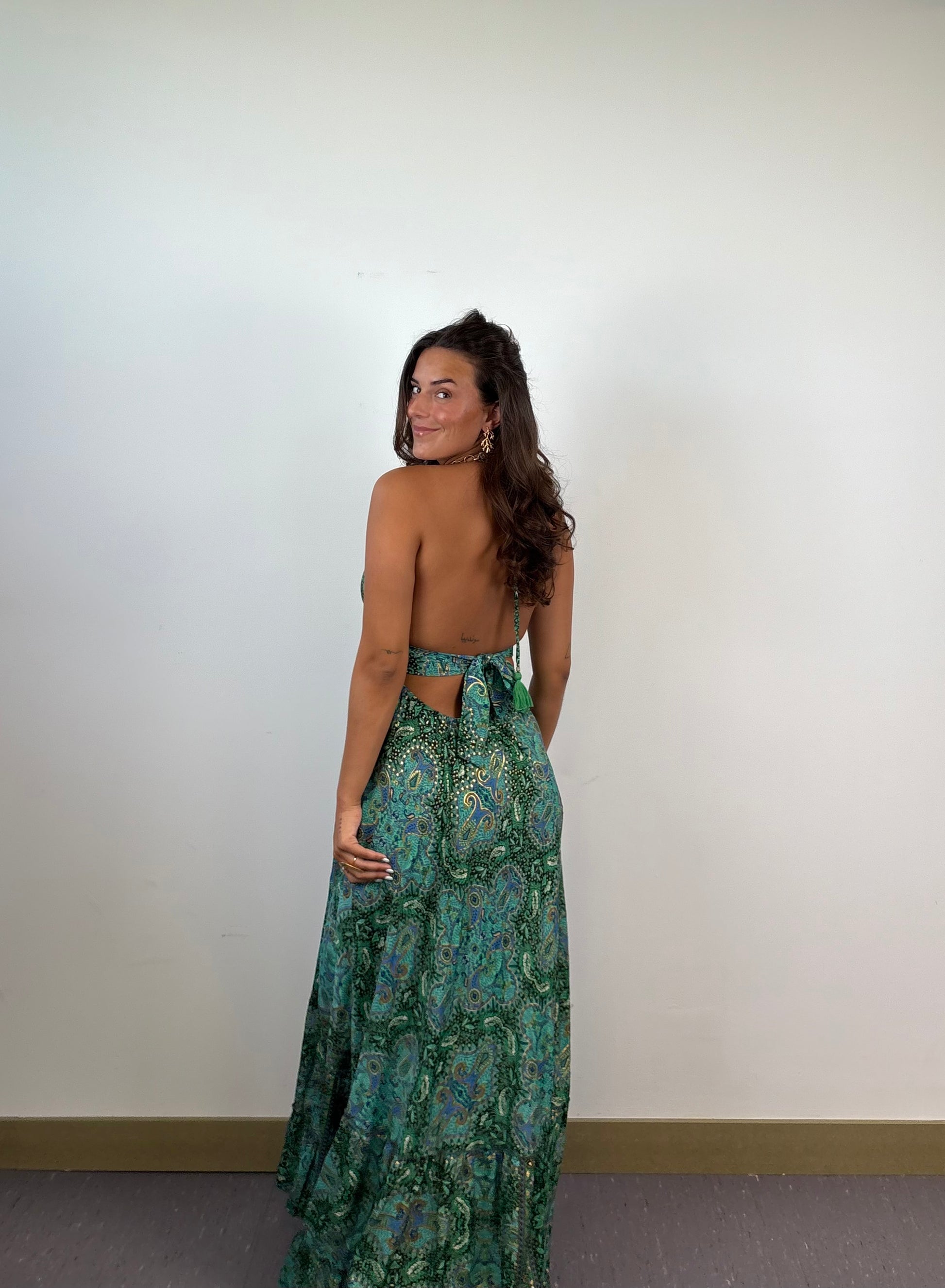 Este vestido largo en tonos verdes y azulados conecta con tu esencia más libre. Su escote triangular y la espalda descubierta con lazo realzan tu silueta con frescura y poder. Una prenda para caminar descalza, sentir la tierra y brillar sin esfuerzo.