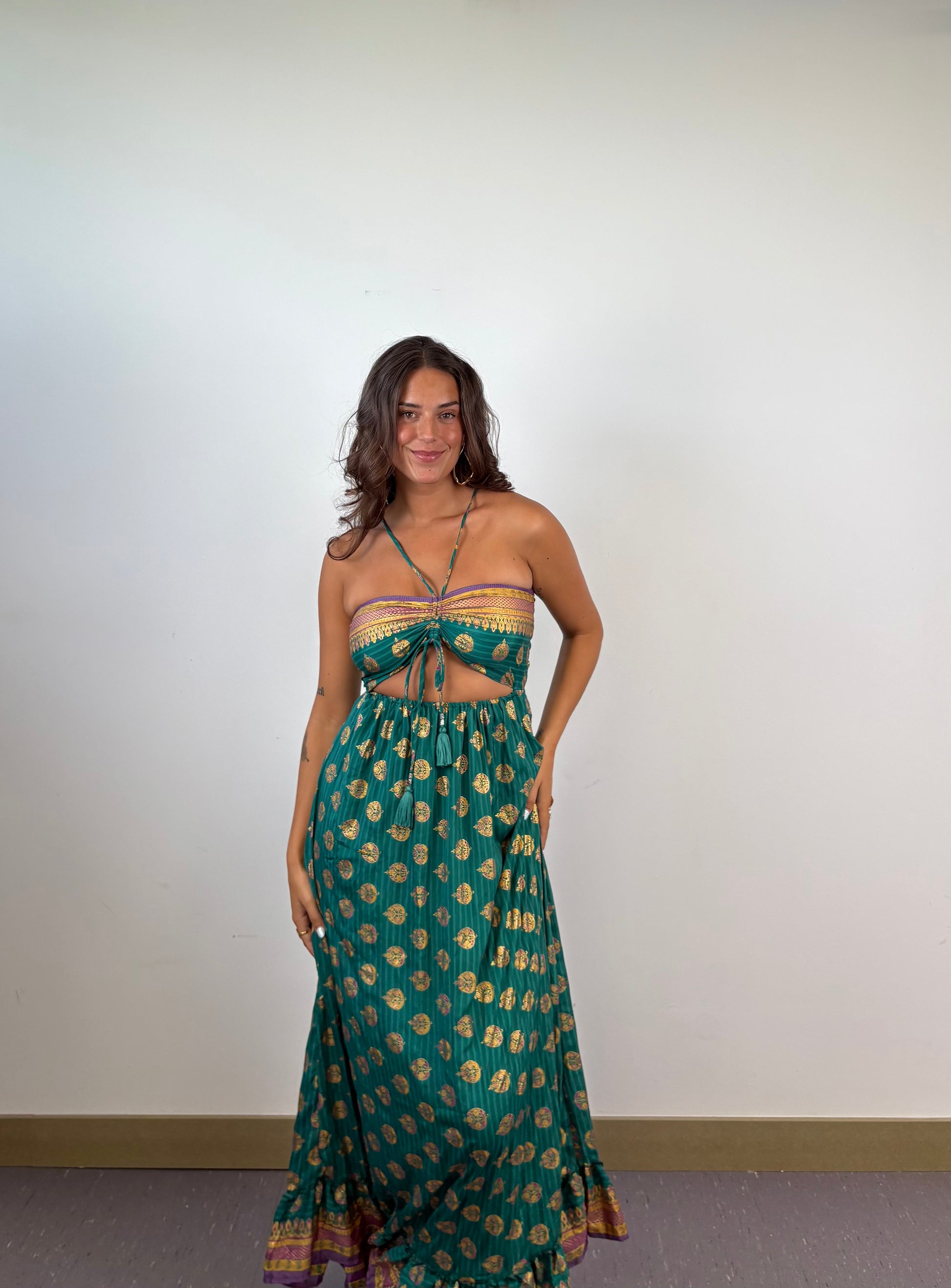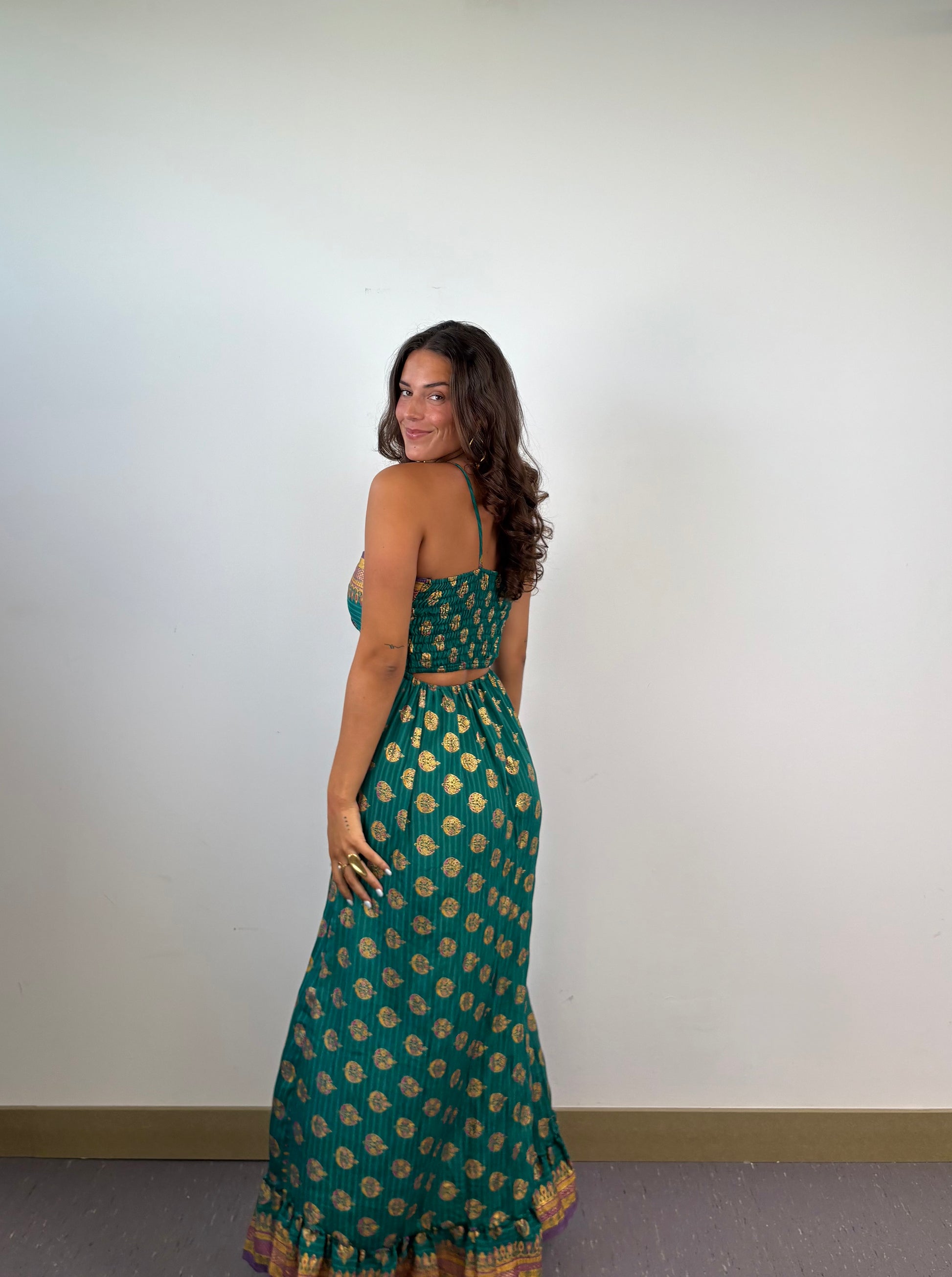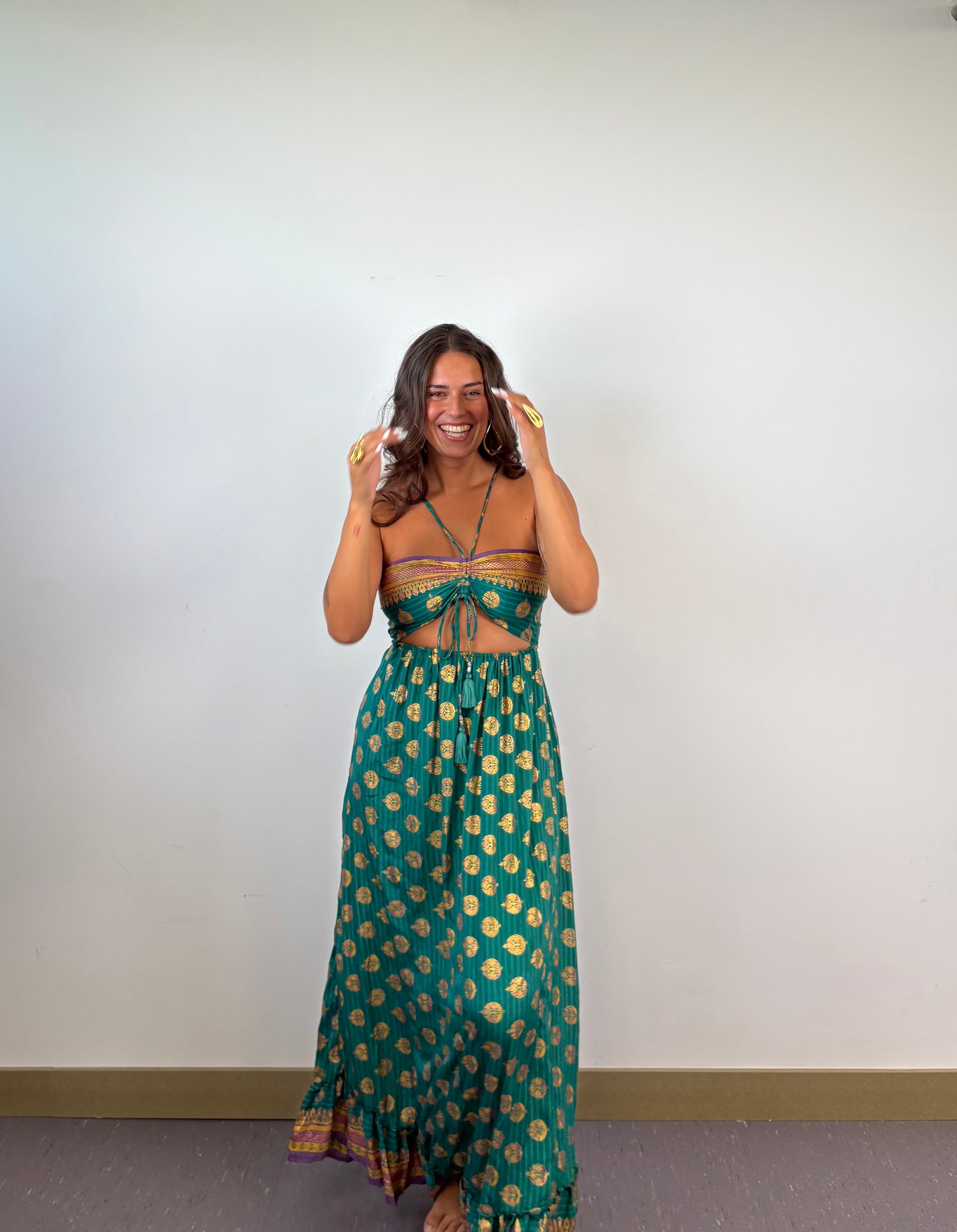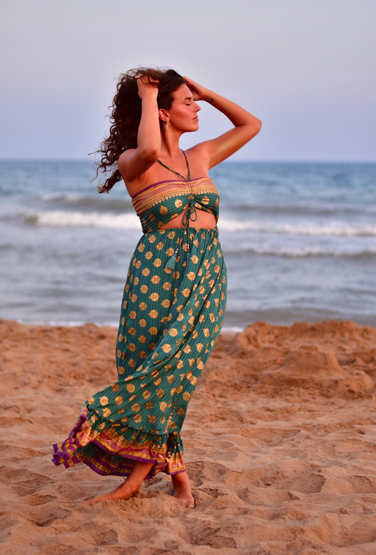 Este vestido largo en verde intenso, con estampado dorado y detalles púrpura, fusiona tradición y sensualidad. Su escote con lazo frontal, abertura sutil y caída fluida lo convierten en una prenda única: poderosa, espiritual y profundamente femenina.