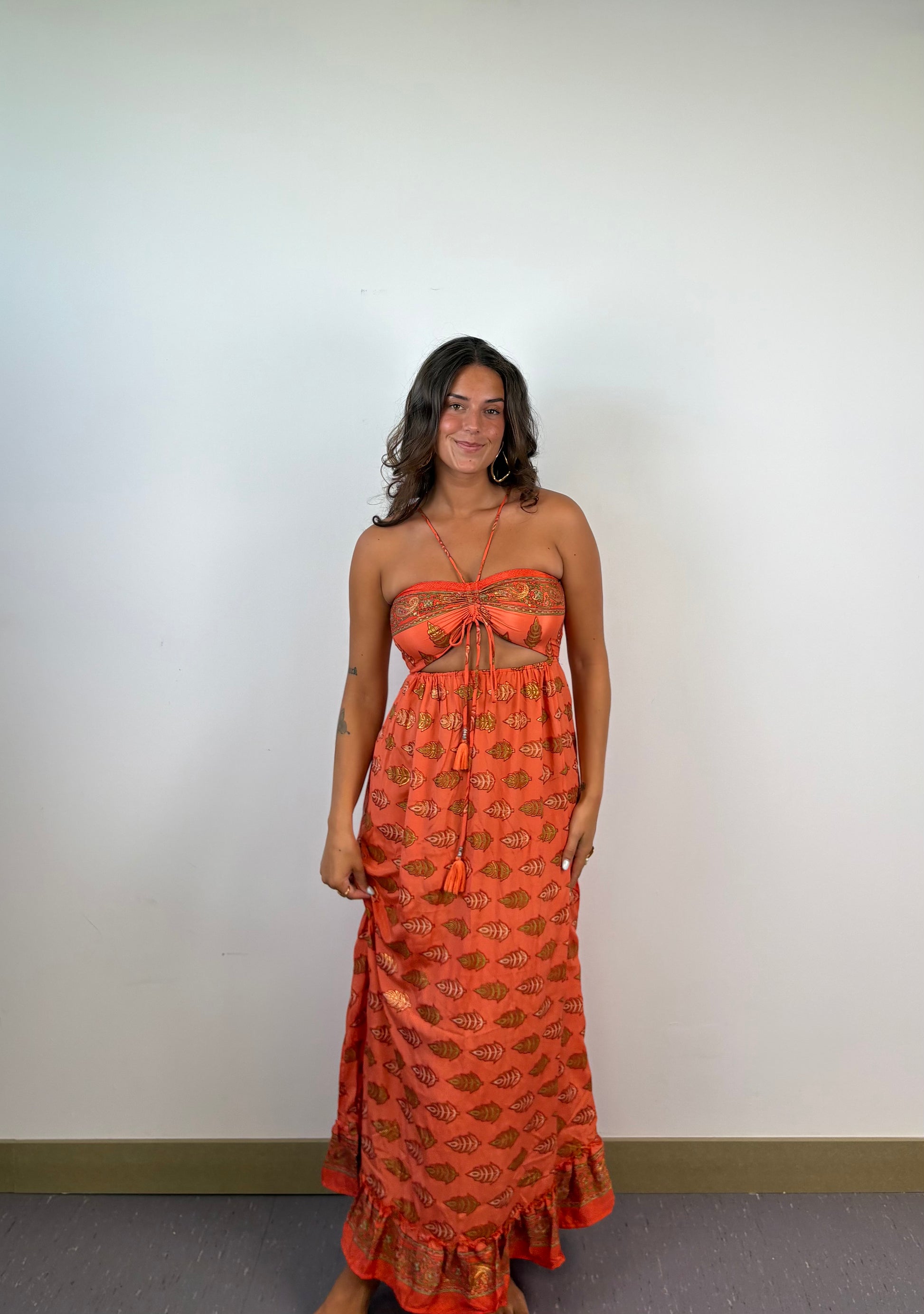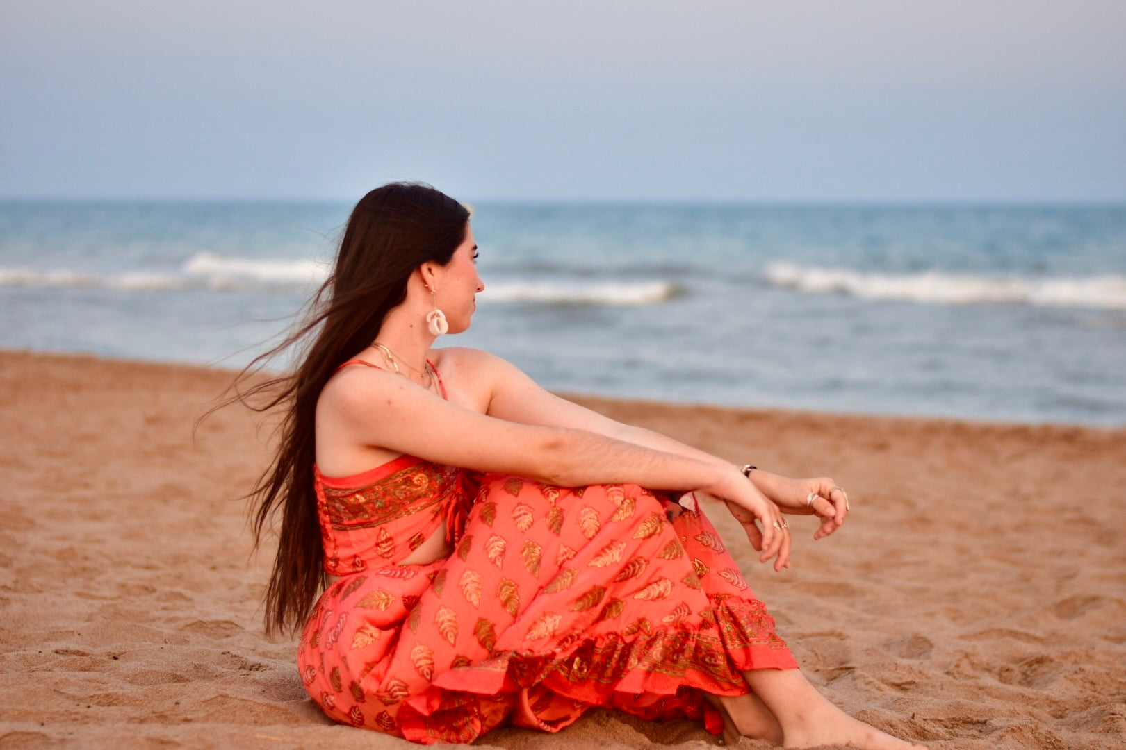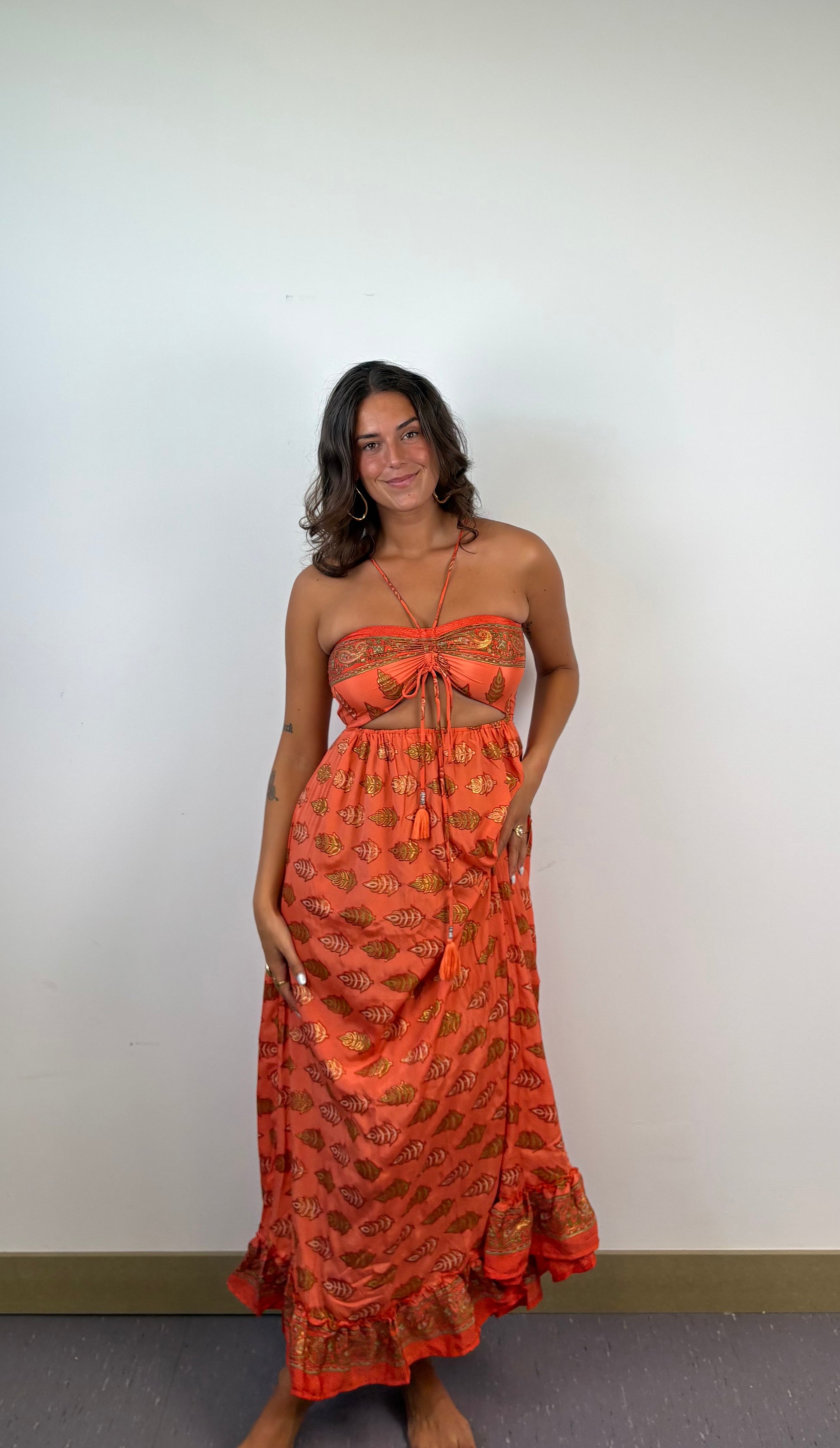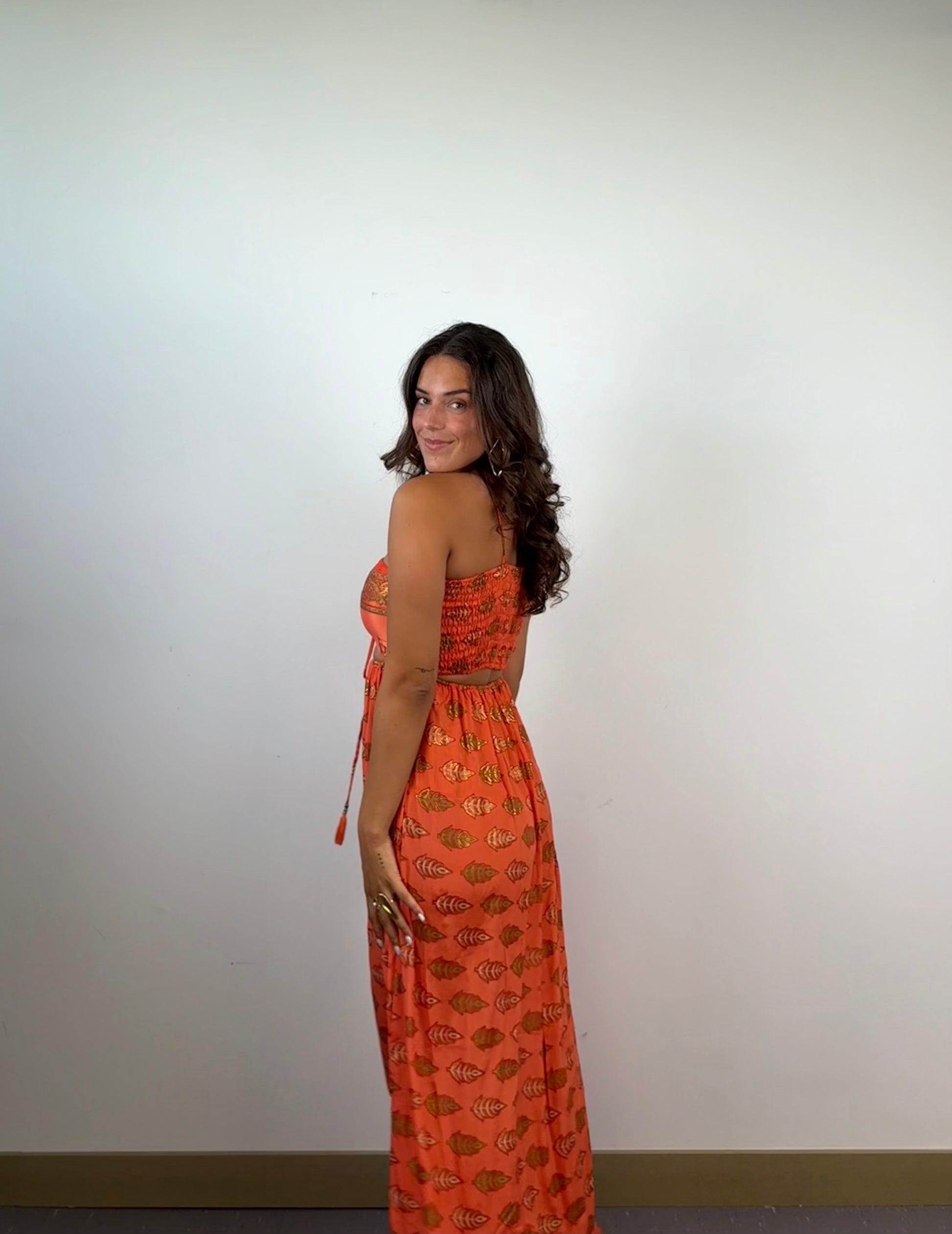 Este vestido largo color naranja atardecer con estampado dorado es puro fuego. Con su escote fruncido, detalles dorados y falda con vuelo sagrado, es la prenda perfecta para encender tu presencia con elegancia tribal y alma vibrante.