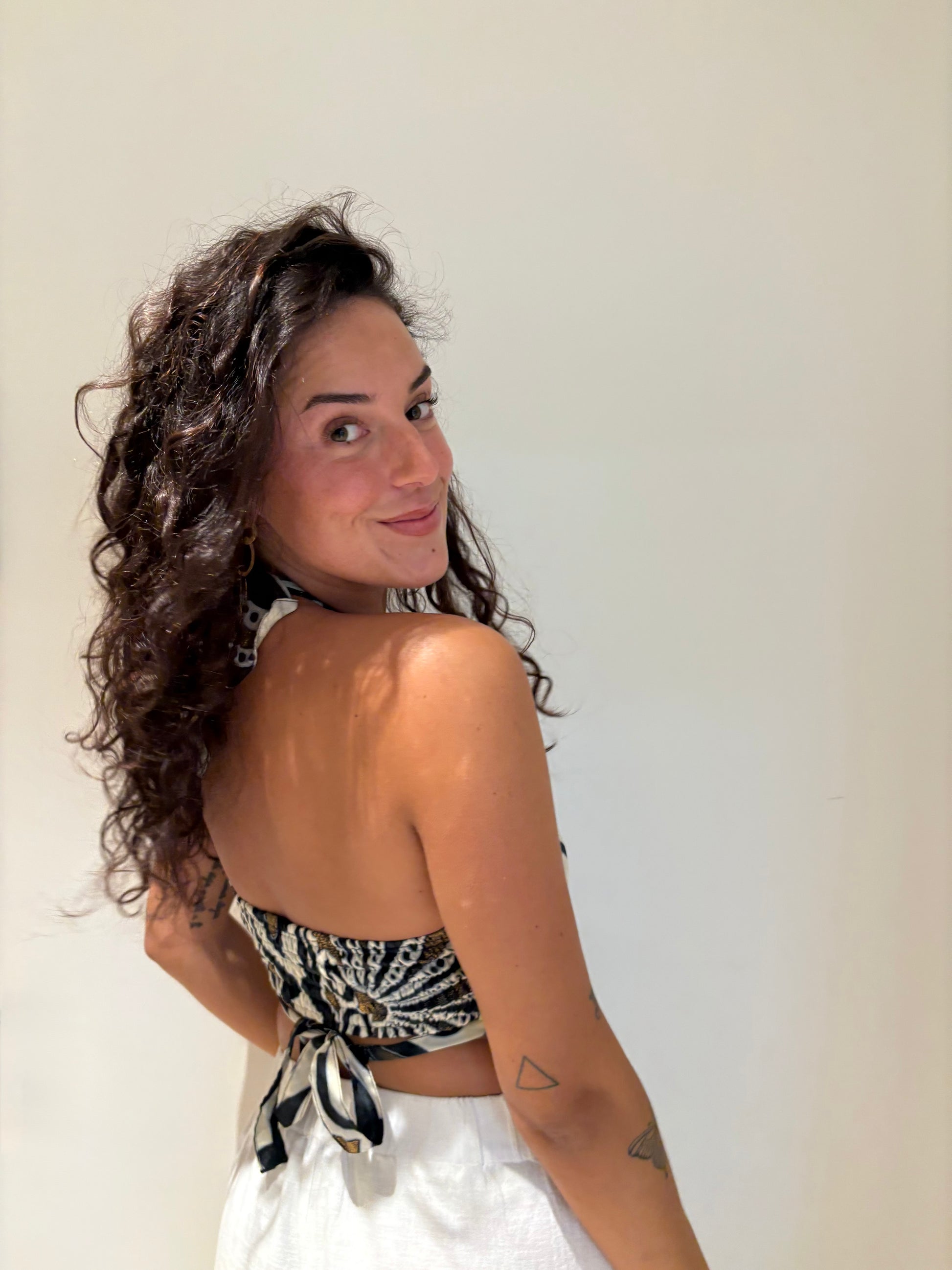 Este top en crema y negro conecta con tu esencia más salvaje. Su diseño tribal y corte halter con aro central despiertan poder, libertad y autenticidad.
